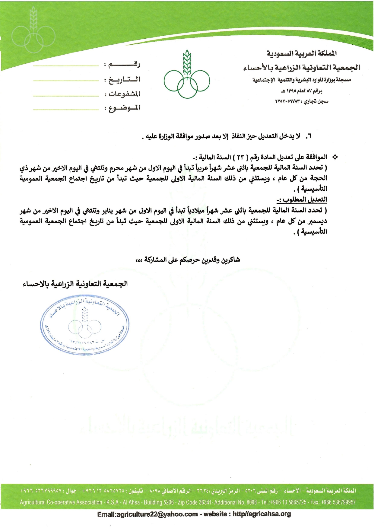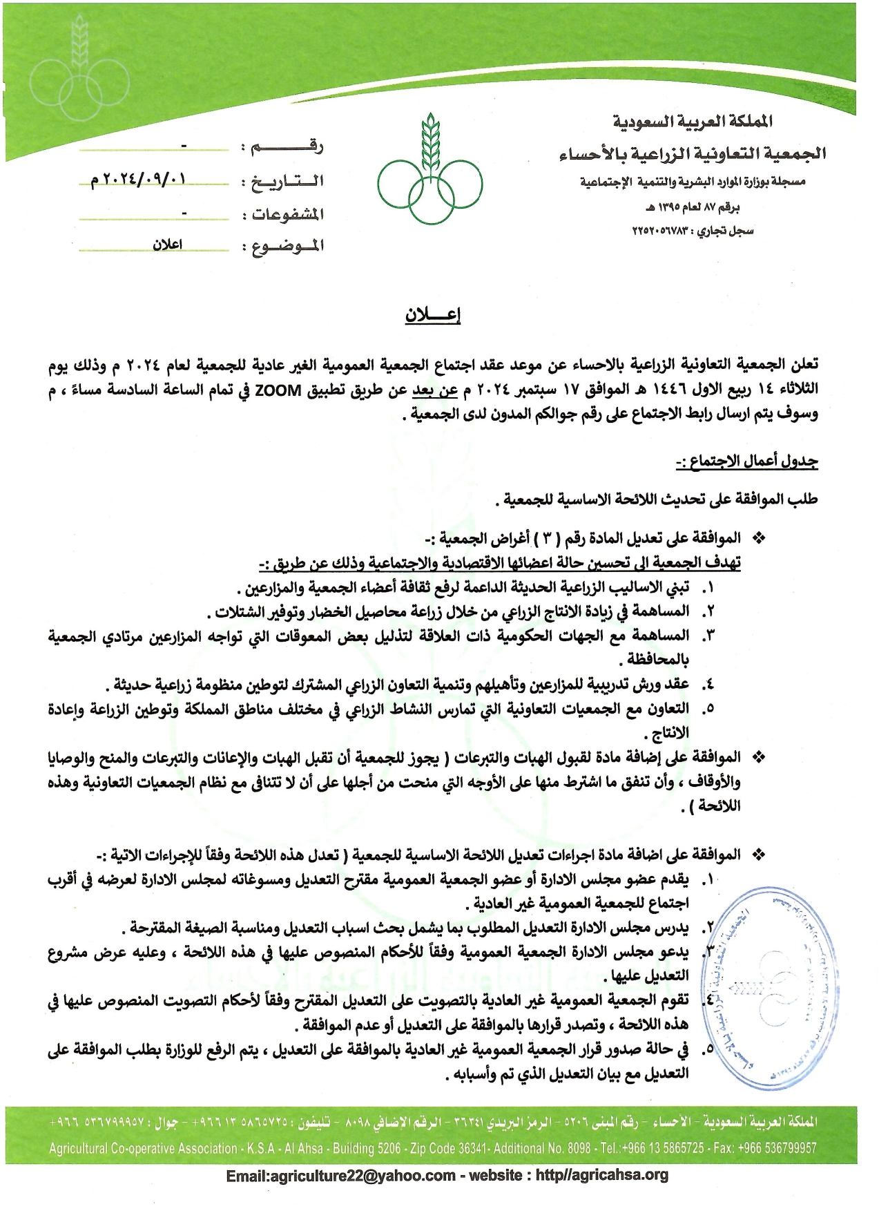 يسر الجمعية التعاونية الزراعية بالاحساء دعوة اعضائها لاجتماع الجمعية العمومية الغير